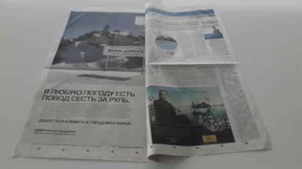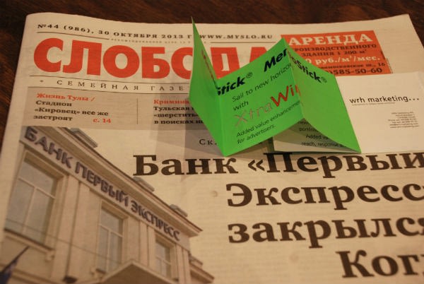 Образцы:Опция «УМНЫЙ КЛЕЙ»«Умный клей» Уникальное и эксклюзивное размещение рекламы на страницах газет. Свежее решение, разработанное специалистами нашей типографии позволяет раздвинуть привычные рамки предлагаемых типографиями услуг, «Пин-ап» варианты размещения рекламной информации без изменения редакционного контента. Приклеивание рекламного продукта на первую или последнюю полосы газет формата TABLOID, либо верхнюю или нижнюю часть первой полосы формата BROADSHEET(А2) При этом, средняя «Пин-ап» приклеивания рекламного продукта к газете составит до 30 000 экз./час Клей, которым приклеивается «Пин-ап» продукт является уникальным. Он настолько хорош, что мгновенно застывает в процессе приклеивания и вполне легко отделяется от газеты не причиняя газете даже малейшего вреда. Дополнительные возможности первой полосы: ∙Выгодное позиционирование рекламного продукта; ∙Разнообразный выбор приклеиваемого продукта; ∙Сохранение производственного графика Издания; ∙ Приклеивание во весь «Пин-ап» Издания; ∙Оптимальная стоимость. Примеры: